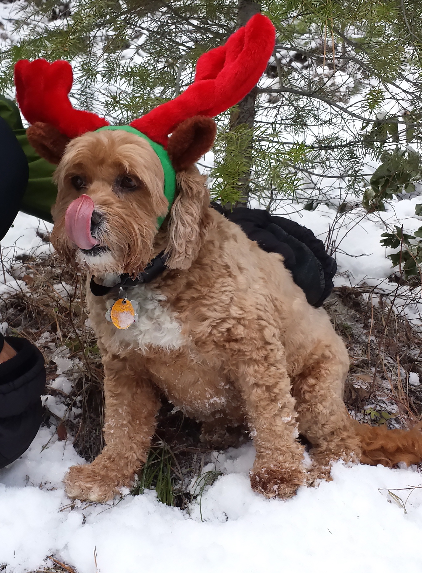 This is our family dog “Bailey”. Here she suffers yet another indignity, persuaded by her need for our love, and her fondness for treats. This is the annual compulsory enjoyment photo-op with The Christmas Antlers.