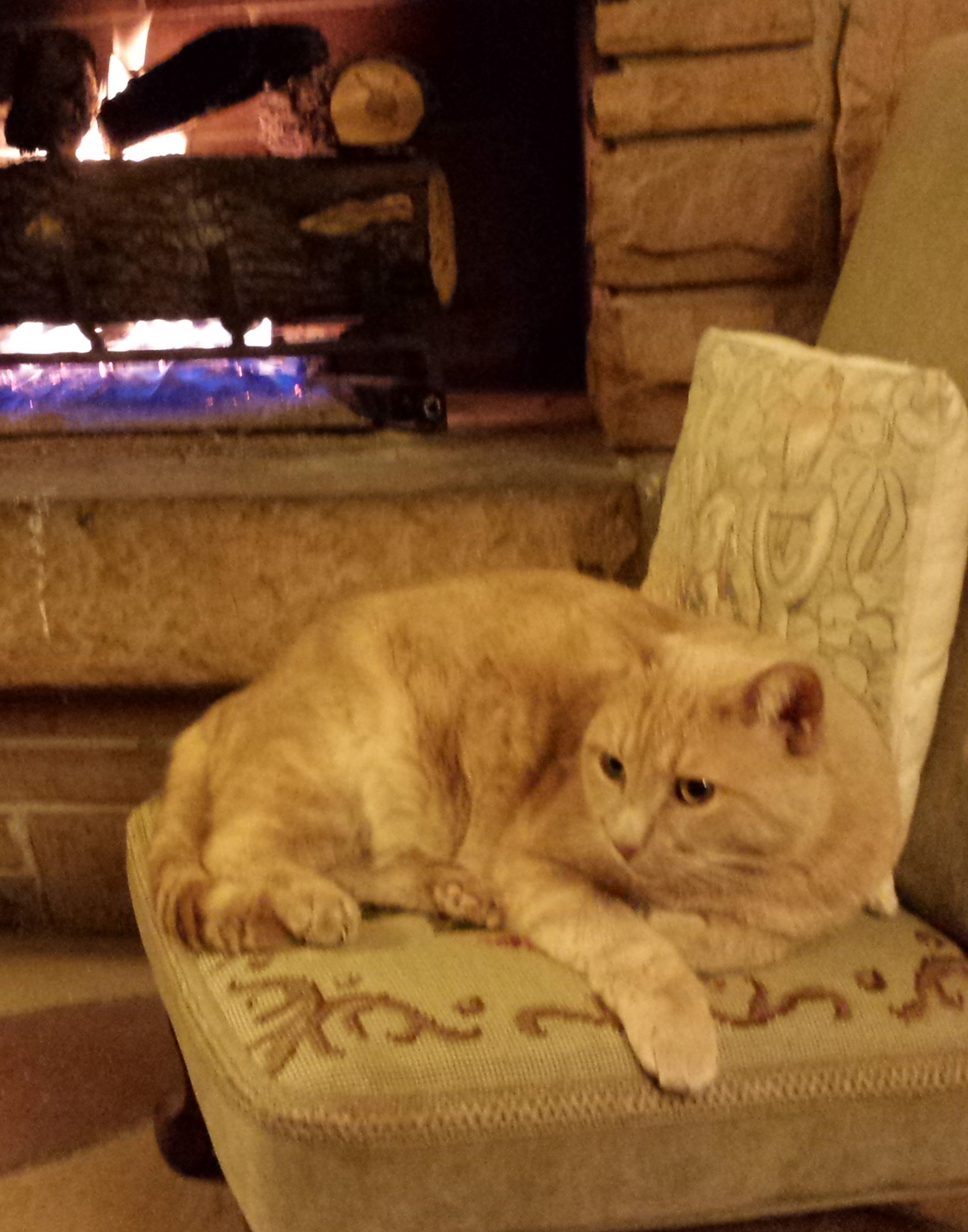 This is our family cat “Mo”. The cat can sit wherever she chooses – including taking the prime spot right in front of the fire.