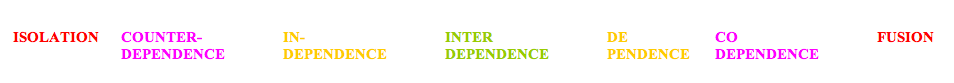 with folks who choose total isolation on the left and folks who want to be fused with others on the right. If you are in a relationship and noticing issues, it’s unlikely you’re at the extremes. More likely you’ll find yourself somewhere between counter-dependence (where a person strives not to be dependent on anyone for anything, thus avoiding attaching to anyone else) and co-dependence (where a person strives not to depend upon themselves for anything, thus avoiding their own ability to be an autonomous human being).