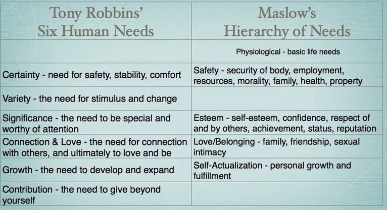 Below are some simple stories illustrating how these needs might be unmet in a relationship. I use the six terms Tony Robbins uses: