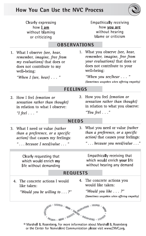 For these conversations, I am totally indebted to Marshall Rosenberg and his work in developing and teaching a process he calls Non-Violent Communication.