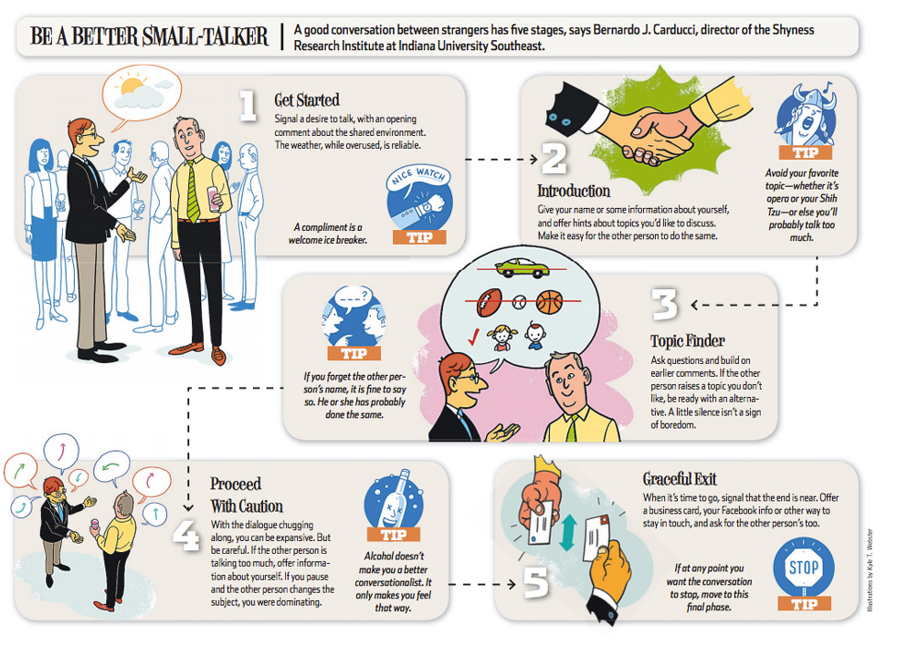 Here’s an info-graphic based on shyness-expert Professor Bernardo J. Carducci’s five (that “Five” again!) stages of a successful conversation.